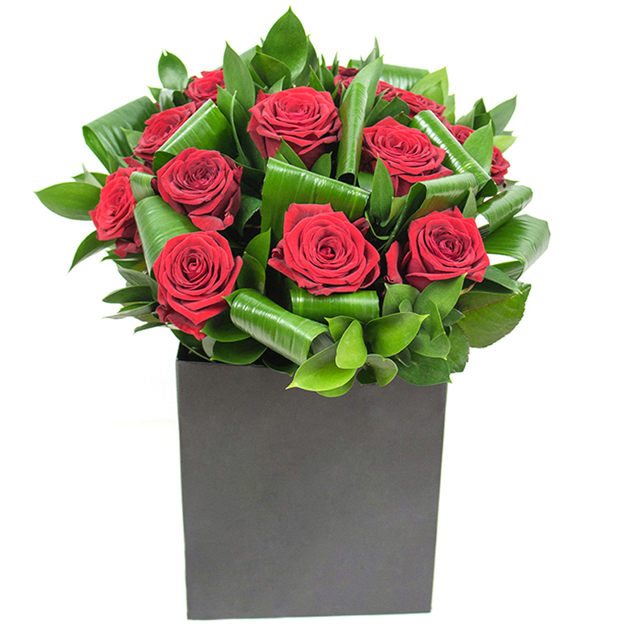 Our charming red rose ensemble combines vibrant red roses with lush aspidistra leaves and graceful ruscus, creating a stunning focal point for any room.
